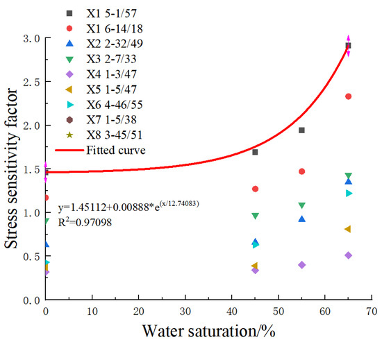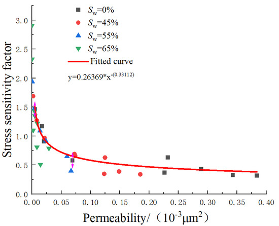 When the water saturation is at 0%, an exponential relationship is observed between the stress sensitivity coefficient and permeability. As permeability decreases, the stress sensitivity coefficient shows an increasing trend. Similarly, at water saturations of 45%, 55%, and 65%, there continues to be an exponential relationship between permeability and the stress sensitivity coefficient. Therefore, it can be reasonably assumed that the relationship between permeability and the stress sensitivity coefficient can be described by an exponential function: