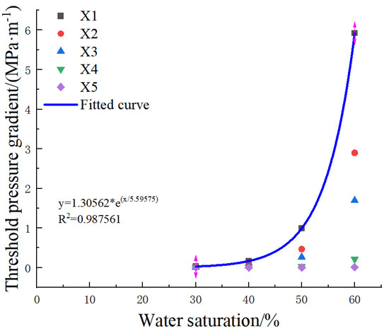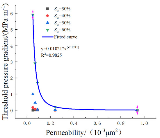 To study the influence of permeability on stress sensitivity under a certain bound water saturation, in the experimental process, it is ensured that the bound water saturation values established for each core sample are essentially consistent. Furthermore, the difference between the maximum and minimum values at each water saturation point does not exceed 3%. As shown in Figure 7, the study investigated the relationship between permeability and initiation pressure gradient for these five core samples at different water saturation levels.