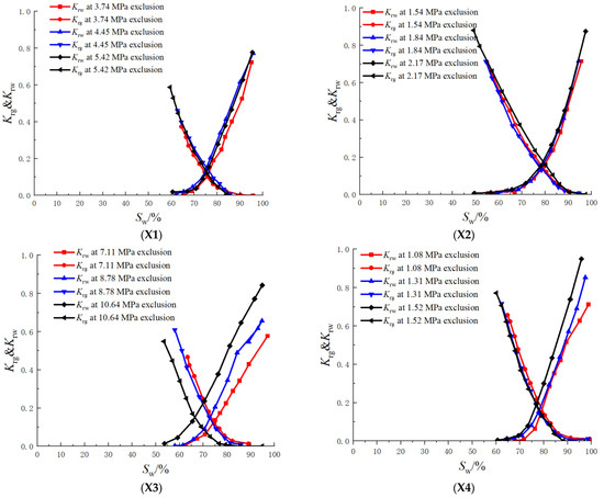 Gas–water phase permeation curves for (X1–X4) rock sample at various pressure gradients.