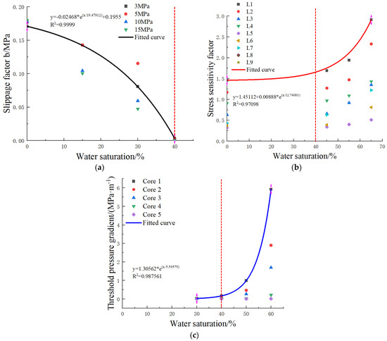 The analysis from Figure 12b leads to the following conclusion: an increase in water saturation results in a decrease in the slip factor, with changes in pore structure being the primary cause of this phenomenon. When water enters the rock framework, interfacial tension forms a water film, reducing the radii of pores and throats, leading to a decline in the formation’s permeability and increasing the stress sensitivity of the reservoir. The presence of water reduces the compressive strength of the rock framework, causing further compression of particles and pores. Under high water saturation conditions, water forms a film on the surface of quartz particles. When effective stress increases, the water film loses balance, leading to pressure dissolution and SiO2 precipitation. Consequently, this reduces the radii of pores and throats as well as the permeability.