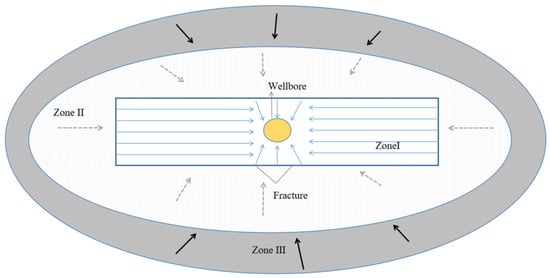 Based on the performance of fractured gas wells in different production stages and the characteristics of gas flow during each stage, the fluid flow region from the reservoir to the fractured horizontal well can be divided into three distinct zones (As shown in Figure 13). These three zones include Zone I: a high-speed non-Darcy flow region inside the fractures. In this zone, gas flows at high speed in the fractures with predominant features being high-speed non-Darcy effects and stress-sensitive effects within the fractures. It is noteworthy that, unlike in vertical fractured wells, the cross-sectional area of horizontal fractured wells is much larger. This leads to differences in fluid seepage compared to vertical fractures, such as radial flow near the wellbore due to the convergence effect after the fluid linearly enters the fractures. Zone II: an elliptical non-Darcy flow region caused by boundary leakage at the fracture boundaries. In this zone, leakage at the fracture boundaries results in an elliptical non-Darcy flow region, where stress-sensitive effects in the matrix and the TPG effect on gas flow dominate. Zone III: an elliptical low-speed non-Darcy seepage region formed by fluid inflow from the surrounding formations. In this zone, fluid inflow from the surrounding formations creates an elliptical low-speed non-Darcy seepage region. The main characteristics of this zone are the simultaneous presence of stress-sensitive effects and TPG effects.