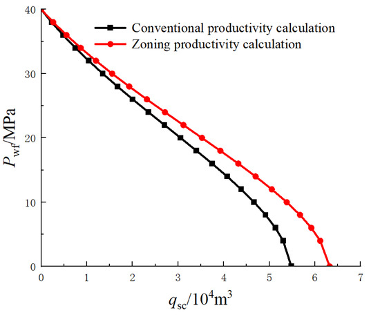 Figure 16 shows that the gas well productivity calculated using the zonal productivity model is significantly higher than the results obtained from existing models. This is because, compared to existing models, the model in this paper considers the seepage characteristics of the fracturing zone. After the fracturing transformation, the reservoir properties and seepage capacity in the transformed area significantly improved. As a result, the gas well productivity increases significantly compared to the traditional models that do not consider zonal divisions.