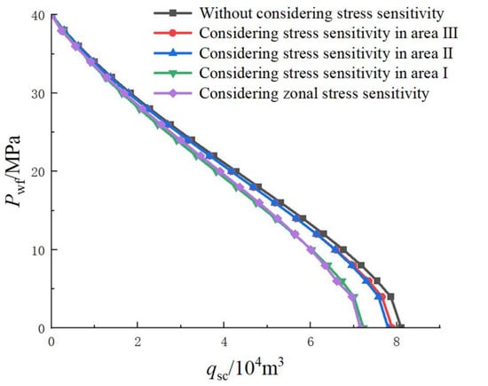 The results in Figure 17 also indicate that, when considering stress sensitivity in a single region alone, the gas well productivity is lower compared to the scenario where stress sensitivity is not considered at all. Moreover, when stress sensitivity in Region I alone is considered, the gas well productivity is lower than when stress sensitivity in Regions II and III is taken into account. This is because although Region I has a higher sensitivity to stress and a more significant impact on seepage due to the presence of fractures, its area is much smaller than that of Regions II and III. Therefore, when stress sensitivity in Region I alone is considered, the productivity is lower than when stress sensitivity in Regions II and III is considered. In other words, only when the stress sensitivity characteristics of all three regions are considered simultaneously, the gas well productivity can be accurately determined.