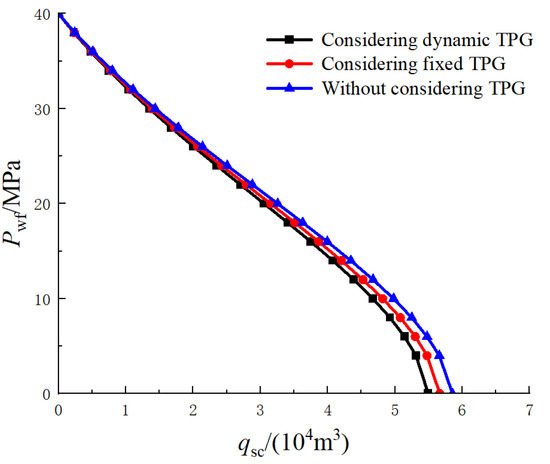 From Figure 18, it can be observed that considering the TPG results in a significant decrease in gas well productivity compared to not considering the TPG. This is because when the TPG is taken into account, the additional resistance to fluid flow increases, leading to a decrease in productivity. Furthermore, when considering the dynamic TPG, gas well productivity further decreases compared to the conventional fixed TPG. This is primarily because when accounting for the dynamic TPG, the TPG in the reservoir gradually increases as the development progresses. The lower the reservoir pressure, the larger the TPG, leading to a more pronounced decrease in productivity.