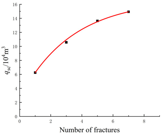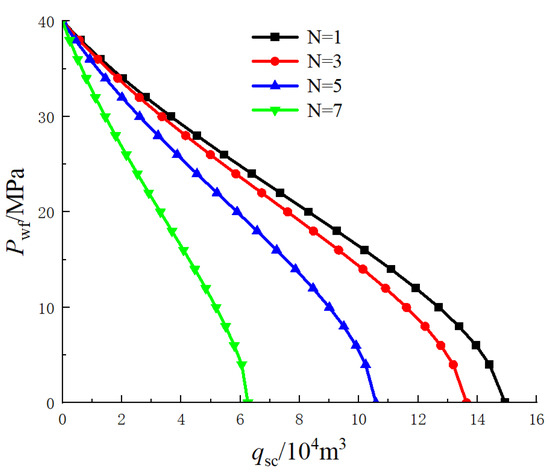 Analyzing Figure 19 shows that as the number of fractures increases, the IPR (Inflow Performance Relationship) curve shifts towards higher productivity. The gas well productivity increases, but the rate of increase becomes smaller. Figure 20 shows the variation in gas well productivity with the number of fractures. For the same hydraulic fracturing gas well, within a certain range, having more fractures leads to a larger effective fracture area, which is beneficial for increasing productivity. However, if the number of fractures continues to increase, the interference between fractures intensifies, leading to mutual inhibition among the fractures. As a result, the increase in gas well productivity becomes smaller, indicating that there exists an optimal number of fractures. Therefore, in practical production, it is crucial to optimize the number of fractures reasonably and avoid productivity losses caused by inter-fracture interference.