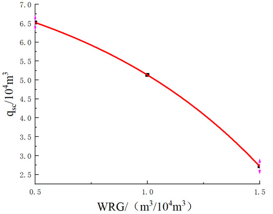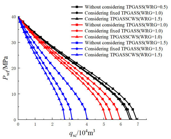 As shown in the Figure 21, different IPR curves are plotted under various water–gas ratios (WRGs): one without considering the stress sensitivity and threshold pressure gradient (TPGASS), one considering a fixed initiation pressure gradient and stress sensitivity, one considering the influence of water saturation on the TPG and stress sensitivity, and one showing the unobstructed flow rate variation curve with changes in the water–gas ratio considering the impact of water saturation on TPG and stress sensitivity. The analysis indicates that gas well productivity decreases after water production, and as the water–gas ratio increases, the curve shifts to the left. After water production, the water phase occupies the large pores initially occupied by the gas phase. More and more gas becomes discontinuous, reducing the relative permeability of the gas phase, which affects gas well productivity. With the increase in the water–gas ratio, the TPG and stress sensitivity effects increase, and the shift of the curve to the right becomes smaller. The lower the bottom hole flowing pressure, the greater the impact of TPG and stress sensitivity effects on gas well productivity. The variation curve of the production capacity with water-gas ratio is shown in Figure 22. Therefore, in productivity modeling, the influence of water saturation on the TPG and stress sensitivity effects should be considered. In practical production processes, appropriate operating procedures should be adopted to avoid early water breakthroughs or delay the time when the gas well starts producing water.