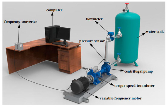 The transient performance test bench for centrifugal pump external characteristics built in this experiment is completely consistent with reference [24]. It mainly consists of a centrifugal pump unit, a testing system, a water tank and a circulation pipeline system, as shown in Figure 1. The pump unit comprises an electric motor, a torque-speed transducer and the pump model to be tested. Two sets of three jaw couplings are connected between the motor and the torque-speed transducer, as well as between the torque-speed transducer and the centrifugal pump to be tested. Each coupling is equipped with rubber cushioning discs to ensure shock free operation during startup.