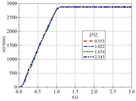 Figure 3 shows the evolution process of instantaneous speed over time under different valve openings during the startup process. For centrifugal pumps, adjusting the valve opening at the outlet to attain a stable operating point can lead to changes in the shaft power of the motor output shaft, which potentially affect the instantaneous speed variation characteristics. From the figure, it can be observed that the trend in the variation in the instantaneous speed curves remains largely consistent under different valve openings, with minor discrepancies. Experimental results indicate that all four instantaneous speed curves reach their stable values at approximately 1.10 s. When the flow ratio Q/Qr is 0.353, 1.022, 1.654 and 2.343 (Qr is the rated flow, i.e., the initial design flow), the corresponding stable speeds are approximately 2893.673 r/min, 2886.677 r/min, 2877.949 r/min and 2869.935 r/min. It is evident that as the valve opening gradually increases, the stable speed of the pump shows a slight decreasing trend. This is because an increase in flow rate leads to an increased load on the centrifugal pump, thereby reducing the stable operating speed. Additionally, due to the initial stationary state of the water in the centrifugal pump before startup and its significant inertia, the instantaneous speed increase is relatively slow within the first 0.06 s after startup. By analyzing the experimental data, it can be found that at the startup time t = 0.20 s, the instantaneous speeds corresponding to the four speed curves are 519.283 r/min, 426.578 r/min, 525.995 r/min and 519.587 r/min; at the startup time t = 0.60 s, the instantaneous speeds corresponding to the four speed curves are 1616.267 r/min, 1609.722 r/min, 1652.229 r/min and 1662.264 r/min; at t = 1.00 s, the instantaneous speeds corresponding to the four speed curves are 2834.338 r/min, 2794.702 r/min, 2814.740 r/min and 2807.031 r/min. It was found that the trend of the speed curve increasing approximately follows a linear pattern after startup for 0.1 s. It can be seen that the speed almost linearly increases with time until 1.1s under the four working conditions, which is attributed to the precise adjustment and control of the motor speed by the frequency converter through precise control of the power frequency and voltage.