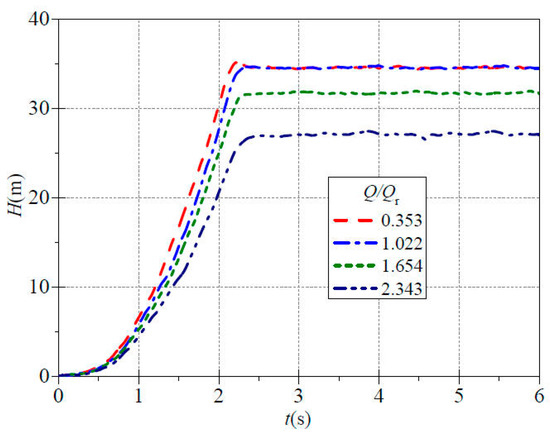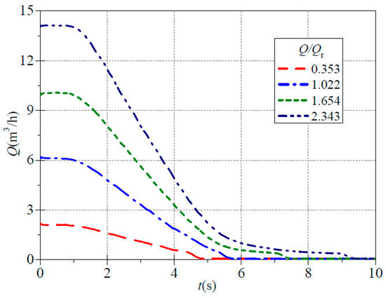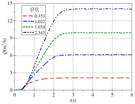 Figure 4 shows the evolution process of instantaneous flow over time under different valve openings during the startup process. It can be seen that the evolution trend of each instantaneous flow rate curve is similar to the speed curve in Figure 3. Its basic characteristics are that in the early stage of rapid startup, the increase is minimal, followed by a rapid increase, and finally it slowly rises to a stable state. The experimental results show that the time required for the four valve openings to reach stable flow rates from small to large is approximately 2.02 s, 2.77 s, 2.96 s and 3.02 s. The corresponding stable flow rate values are approximately 2.078 m3/h, 6.092 m3/h, 9.924 m3/h and 14.016 m3/h. It is evident that as the valve opening increases, the stable flow rate after startup also increases, and the time required to reach a stable state becomes longer. Simultaneously, the rate of increase in the corresponding flow curve will gradually increase with the larger valve opening. During the early stage of the startup process, approximately before t = 0.36 s, the rising speed of each flow curves for all valve openings is very slow with minimal differences. There is little difference in instantaneous flow rates among the four valve openings with flow ratios of 0.353, 1.022, 1.654 and 2.343 with instantaneous values of only 0.170 m3/h, 0.182 m3/h, 0.052 m3/h and 0.084 m3/h, respectively. Comparing the instantaneous flow curve during the startup process with the speed curve, it can be found that the flow curves gradually rise with the increasing speed. However, the upward trend is relatively gentle, and the time required for the flow rate to reach stability noticeably lags behind the time for the speed to stabilize. Due to the fact that the entire water in the system is in a stationary state before startup, in the early stage of rapid startup, approximately before 0.6 s, the speed curve rises rapidly, while the flow rate curve increases relatively slowly.