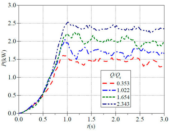 The instantaneous speed and torque during the test are obtained by means of a speed-torque transducer between the centrifugal pump and the motor, which is used to calculate the instantaneous shaft power of the pump main shaft during rapid startup. Figure 6 shows the evolution of shaft power over time during the startup process under four different valve openings. The shaft power curves rise slowly in the early stage of rapid startup, then rapidly increase until there is an impact phenomenon on the shaft power curve, and ultimately shows periodic fluctuations overall. It can be seen that the upward trend of the instantaneous shaft power curve under each valve opening is basically similar, and maintains a high degree of consistency with the rotational speed curve in Figure 3 at the time of change, which is mainly due to the fact that the rotational speed and the shaft power are measured by the same instrument and have a high degree of correlation. In the early stage of rapid startup of centrifugal pumps, the rate of shaft power increase is relatively small, and then rapidly increases. At flow ratios of 0.353, 1.022, 1.654 and 2.343, the peak shaft power is reached at approximately 0.92 s, 0.96 s, 0.99 s and 1.02 s, respectively. The corresponding peak shaft power is approximately 1.612 kW, 2.103 kW, 2.249 kW and 2.555 kW. It is not difficult to see from the graph that during the rapid rise stage of the shaft power curve, the rising rate gradually increases and the time to reach the peak shaft power is also delayed as the valve opening increases. After reaching the peak, the power curves of the four shafts gradually decrease, showing varying degrees of fluctuation characteristics. The average shaft power corresponding to the valve opening from small to large is about 1.445 kW, 1.694 kW, 2.015 kW and 2.340 kW. It can be seen that increasing the valve opening will gradually increase the shaft power of the centrifugal pump during stable operation. It can be observed that an increase in valve opening will cause the shaft power of the centrifugal pump to gradually increase during stable operation. Simultaneously, it can be calculated that the corresponding impact shaft power (the difference between peak shaft power and average shaft power) is 0.167 kW, 0.409 kW, 0.234 kW and 0.215 kW and the shaft power impact is most pronounced at the rated flow rate.