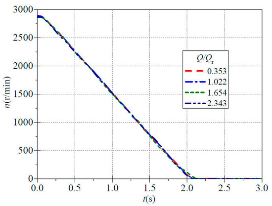 The stopping experiment of the centrifugal pump was carried out by power cut off. The evolution of the impeller speed of the centrifugal pump during the stopping process is shown in Figure 7. From the figure, it can be observed that the trend in the variation in the instantaneous speed curves remains largely consistent under different valve openings with minor discrepancies. During the initial stage of power cut off in the centrifugal pump stopping process, the impeller speed curves do not immediately decrease. Prior to t = 0.06 s, all speed curves maintain a relatively high speed for a short period of time before showing a significant decrease. This is mainly because at the moment of power cut off, the impeller is still rotating at a high speed and the inertia effect is significant. The resistance effect of the fluid on the impeller does not immediately manifest resulting in the impeller speed not instantly dropping. From the figure, it can be seen that under the flow ratios of 0.353, 1.022, 1.654 and 2.343, the corresponding instantaneous speeds at 0.06 s are 2885.441 r/min, 2880.707 r/min, 2868.145 r/min and 2864.886 r/min, respectively. After the stopping time t = 0.06 s, the speed curve decreases rapidly. At approximately 0.50 s, the instantaneous speed values corresponding to each flow ratio are approximately 2242.283 r/min, 2226.019 r/min, 2201.791 r/min and 2227.304 r/min; The corresponding instantaneous speed values at 1.00 s are approximately 1511.841 r/min, 1491.916 r/min, 1468.786 r/min and 1501.362 r/min. At 1.50 s, the instantaneous speed values are approximately 761.096 r/min, 736.160 r/min, 708.207 r/min and 766.901 r/min. Comparing it with the startup speed curve shown in Figure 3, it is not difficult to observe that under various valve opening conditions, the decrease trend of the impeller speed after power cut off follows a linear pattern, similar to the trend of the startup speed. Moreover, approximately after 2.10 s from the power cut off, the impeller nearly stops rotating which is significantly longer than the time required for the speed to stabilize during startup. Although the speed characteristic curve is similar to that during startup, the internal reason for the decrease in impeller speed during shutdown is different from that during startup. During the starting process, the pump impeller is driven by an electric motor, which overcomes the torque generated by the fluid resistance inside and outside the impeller and converts its rotational kinetic energy into the kinetic energy and pressure energy of the fluid.