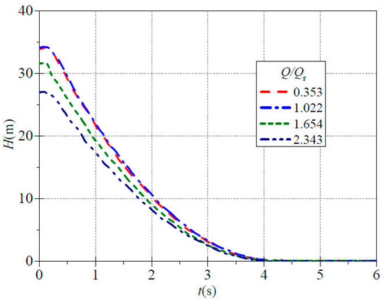 Figure 9 shows the evolution of instantaneous flow over time during the stopping process under four different valve openings. From the figure, it can be found that in the early stage of stopping, the instantaneous head curve is similar to the instantaneous speed and flow curve, neither of which directly decreases at the moment of power outage, but maintains a stable state for a short period of time. In the case of flow ratios of 0.353, 1.022, 1.654 and 2.343, the time nodes at which the decline begins are approximately 0.16 s, 0.16 s, 0.13 s and 0.09 s, respectively. It is evident that an increase in valve opening causes the point at which the head curve starts to decrease to slightly advance, which is in contrast to the phenomenon of delayed timing of flow rate curve decline during the stopping process. Subsequently, the head curves rapidly decline. At a stopping time of t = 1.00 s, the corresponding instantaneous heads are 21.431 m, 21.792 m, 19.053 m and 17.243 m. When the stopping time is 2.00 s, the instantaneous heads have already decreased to 10.273 m, 10.737 m, 9.122 m and 8.131 m. At 3.00 s after stopping, the instantaneous heads are 3.080 m, 3.327 m, 2.631 m and 2.437 m. Through analysis, it can be determined that during the stopping time from t = 1.00 s to 2.00 s, the respective decrease in instantaneous head is 11.158 m, 11.055 m, 9.931 m and 9.112 m. When the stopping time is from t = 2.00 s to 3.00 s, the corresponding difference in head values are 7.193 m, 7.41 m, 6.491 m and 5.694 m. It can be seen that the rate of decline is gradually slowing down. Simultaneously, as the valve opening increases, the rate of decline in the head curves with flow ratios of 1.022, 1.654 and 2.343 gradually decrease, which is consistent with the variation pattern of the rising rate in the head curves during the startup process. The head curves with a flow ratio of 0.353 and 1.022 have relatively small differences during the descent process. The instantaneous head curves of the final four valve openings all reach a stable state at approximately 4.11 s, with minimal fluctuations. The corresponding average stable head values were approximately 0.056 m, 0.070 m, 0.068 m and 0.007 m. In theory, when the stopping process is completed, the corresponding head value at any valve opening should remain constant at zero. The reason for the failure of the head to decrease to zero is the existence of a height difference in the installation position of the pressure sensor. Additionally, at this point, the head values are relatively small, and there may be certain measurement errors in the instruments, resulting in unequal average head values in the end. Furthermore, similar to the speed and flow rate curves, the time required for the head curve to decrease to zero during the stopping process is noticeably greater than the time required for the head to rise to a steady value during startup.