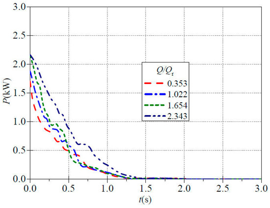 Figure 10 shows the evolution of shaft power over time during the stopping process under four different valve openings. It can be observed from the graph that while the overall power curves of various shaft show a declining trend, this is because before the power outage, the impeller was driven by a motor, which belongs to the so-called “active torque”. However, after the power outage, the impeller no longer has “active torque” from the motor. Nevertheless, due to the rotational inertia of the impeller itself, the impeller will continue to rotate, but at a progressively lower speed due to the fluid resistance torque exerted on the impeller. There are significant differences from the speed, flow rate and head curves during the stopping process. The power curve with a flow rate ratio of 1.654 exhibits the most pronounced fluctuation and is the first to show fluctuation, corresponding to a time point of about 0.13 s, at which point the instantaneous shaft power value is about 1.685 kW. In the end, all shaft powers are reduced to zero, but the required time varies slightly. When the flow ratio is 0.353, 1.022 and 1.654, the time points when the shaft power drops to zero are all about t = 1.25 s, with minimal difference. Only when the flow ratio is 2.343, the time for the shaft power to decrease to zero is about t = 1.47 s. It can be found that the shaft power curves consistently exhibit varying degrees of fluctuation, with the descent rate gradually slowing down during the descent process. Moreover, at the moment of power outage, the shaft power does not remain stable for a period of time but immediately decreases. By comparing with Figure 6, it can be seen that the time required for the power of the shaft to drop to zero when the pump is stopping is longer than the time required for the power of the shaft to stabilize when the pump is at startup. Additionally, the fluctuations during the descent process are more pronounced.