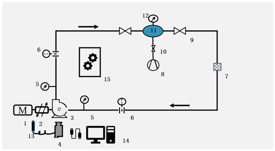 Schematic diagram of the experimental system. 1—Servo motor; 2—torque sensor; 3—model pump; 4—high-speed camera; 5—pressure sensor; 6—flow sensor; 7—Y type filter; 8—water ring vacuum pump; 9—electric regulating valve; 10—ball valve; 11—water tank; 12—pressure gauge; 13—photoelectric sensor; 14—data acquisition system; 15—power distribution cabinet.