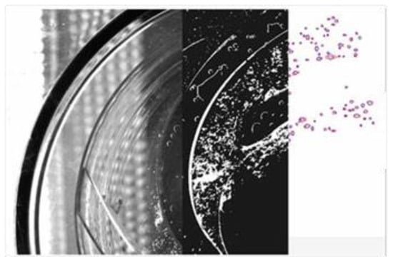 Schematic diagram of different image processing stages: (left: shooting the original image; middle: the processed picture; right: bubble outline).