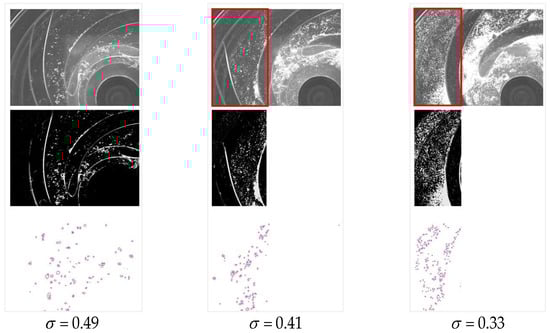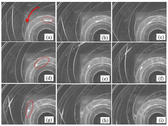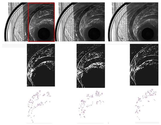 Various experimental phenomena were observed under different cavitation numbers, some of which are illustrated in Figure 6. As the cavitation number decreases, cavitation first initiates at the suction surface near the blade inlet. At this stage, the gas volume fraction is relatively low, and numerous small bubbles are dispersed within the liquid phase, maintaining significant spacing between them. With further reduction in the cavitation number, the size and length of the cavitation bubbles gradually increase. The flow continuity is disrupted, and the cavitation bubble cluster begins to break apart starting from the rear end. The shed cavitation bubble groups move downstream alongside the main body. During this process, the pressure in the flow channel sequentially increases, leading to the gradual shrinking and collapsing of the cavitation bubbles. When the cavitation number reaches 0.36, the resulting cavitation nearly covers the entire surface of each blade, obstructing the flow passage significantly. It becomes challenging to distinguish clear phase interfaces within the air mass. Isolated bubbles can still be observed at the rear of the air mass, and their shapes are predominantly irregular ovals.