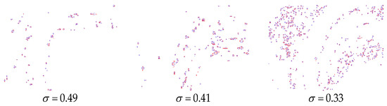 Figure 7 displays the image recognition results of the 1/4 flow field at various cavitation numbers. Figure 8 provides an enlarged view of the local results. Based on the experimental findings, it is evident that the spherical images cannot sufficiently substitute for the actual experimental results. Consequently, oval shapes were adopted to better depict the characteristics and morphology of the cavitation bubbles. To further analyze the morphology characteristics of the cavitation bubbles, the length–diameter ratio of the bubbles was calculated under different working conditions. The statistical results are shown in Figure 9.