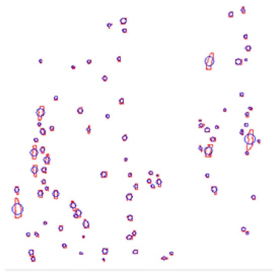 Enlarged image of local recognition results of a single frame (red: cavitation bubble outline; blue: equivalent spherical bubble outline).