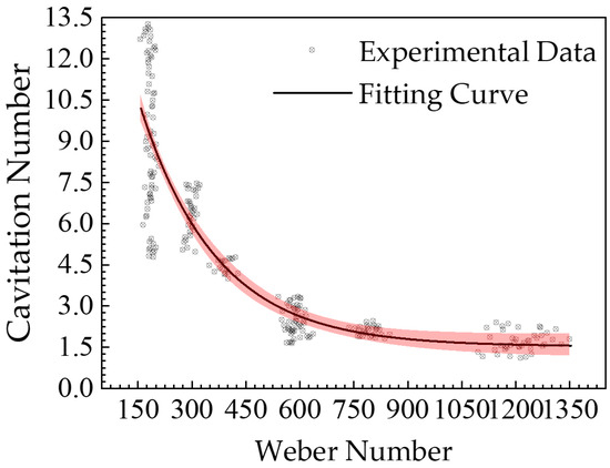 Based on the analysis mentioned above, a significant amount of bubble-related data was collected under various experimental conditions. After processing and analyzing the data, the relationship between the cavitation number and the Weber number in the centrifugal pump was determined. Figure 12 presents the graphical representation of this relationship, illustrating how the cavitation number corresponds to different Weber number values in the centrifugal pump.