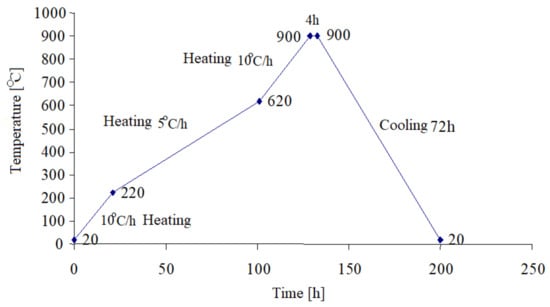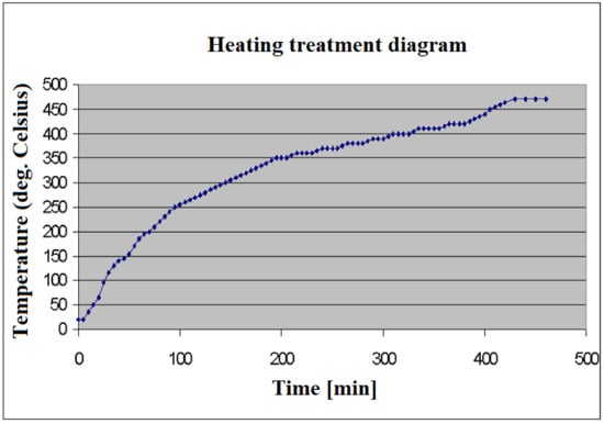 The obtained samples were mixed, homogenized, and then pressed at 60 MPa followed by the carbonization thermal treatment in the absence of air and according to the heating diagram shown in Figure 3.