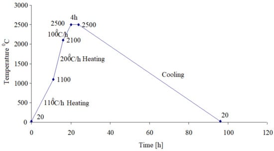 The heating diagram is shown in Figure 4. The graphitization process took place in an Acheson industrial graphitization furnace which uses the Joule–Lenz effect. Thus, the furnace has 2 metallic electrodes connected to the electric grid and the material subjected to the graphitization process forms the core or resistance of the furnace. By plugging in the electrodes, the electric current passes through the core formed by the carbonaceous material and heats it. Thus, the necessary temperature of 2500 °C can be reached and the graphitization process is taking place. The furnace was also produced by Nabertherm GmbH, Lilienhal, Germany, and consists of an open-brick structure with metallic electrodes at its ends. The core of the furnace was covered by a mixture of Al2O3 powder, coke and organic shorts in order to ensure both thermal and air insulation.