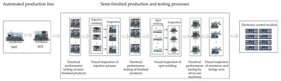 Digital electronic detonators represent advanced industrial devices that integrate traditional detonators with electronic control technologies. Electronic control modules are utilized to perform various functions, such as time constraints and safety control. The integration of advanced features, including precision, safety measures, and remote-control capabilities significantly improve the effectiveness and safety of blasting operations. The electronic control module plays a vital role in the digital detonator, as it is responsible for precise programming and timing control to achieve explosion triggering with millisecond-level precision. The manufacturing process of the electronic control module comprises several sequential stages. It begins with the assembly and soldering of printed circuit boards (PCBs) in an automated production line of surface mount technology (SMT). Subsequently, these PCBs are processed using automated optical inspection (AOI) to transform them into semi-finished products. Then, these semi-finished products need to undergo a series of production and testing processes, including electrical performance testing of the semi-finished products, a visual inspection of the injection process, electrical performance testing of the finished products, a visual inspection of spot welding, electrical performance testing of the finished products using all-in-one machines, and a visual inspection of the resistance and bridge wire. The production flow of the electronic control modules is shown in Figure 1.