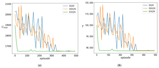 Based on the outcomes presented in Table 5, the improvement offered by the DDQN algorithm is not evident, which solely incorporates the target network compared with the original DQN algorithm. However, with the incorporation of both the target network and the dueling network in the D3QN algorithm, significant improvements in performance are achieved when solving scheduling problems of five different sizes. The D3QN algorithm not only yields superior results in terms of the makespan and the total tardiness, but also exhibits enhanced convergence stability. Taking 100 jobs as an example, the variation trends of the makespan with respect to the number of iterations are shown in Figure 4a, and the variation trends of total tardiness with respect to the number of iterations are shown in Figure 4b. The experimental results indicate that the target network and the dueling network can mutually boost each other and achieve a better performance.