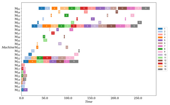 Taking the number of the jobs with n = 15 as an instance, the D3QN algorithm can obtain the optimal scheduling solution with a makespan of 272 and a total tardiness of 1478 for the problem . The Gantt chart of the optimal schedule for the instance with n = 15 is shown in Figure 5.