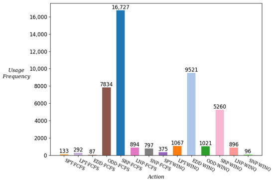 In order to analyze the usage frequency of various actions involved in the optimal strategy based on the experimental results, a usage frequency distribution diagram of the 14 job–machine combination rules is generated. As shown in Figure 6, the actions that have been used more than 5000 times include ODD-FCFS, SRP-FCFS, EDD-WINQ, and SRP-WINQ. These actions have made significant contributions to achieve optimal solutions. The usage frequency of other actions exhibits a relatively even distribution, and the performance is not particularly noteworthy.