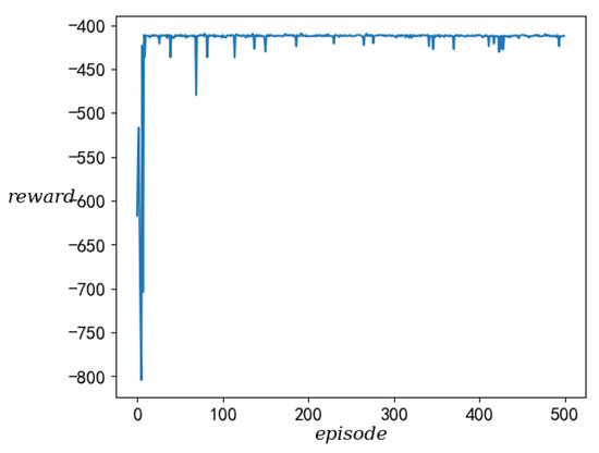 Based on the D3QN algorithm, the parameters are set as follows: α is the learning rate, which controls the magnitude of the weight parameters and updates in the training process of the neural network, and it is set at α = 0.001; γ is the discount factor used to calculate the cumulative rewards, and it is set at γ = 0.95; ε represents the greedy factor, and it is set at ε = 0.6. The upper limit of iterations Max_episode is 500. The parameters of the problem are set as follows: the processing time of the jobs at each stage are generated by the uniform distributions, the processing times of the electrical performance testing , and the processing times of the visual testing .