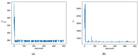 The variation trend of the reward value with respect to the iteration times in the D3QN algorithm is shown in Figure 7. The cumulative reward of the algorithm tends to rise as the iteration time increases. The algorithm tends to converge approximately after 50 iterations. The variation trends of the makespan with respect to the number of the iterations are shown in Figure 8a, and variation trends of the total tardiness with respect to the number of the iterations are shown in Figure 8b. From this figure, as the iteration time increases, both the makespan and the total tardiness show a declining trend. This indicates that the D3QN algorithm can obtain better near-optimal solutions and outperform the heuristic rules in both effectiveness and efficiency measurement for the problem .