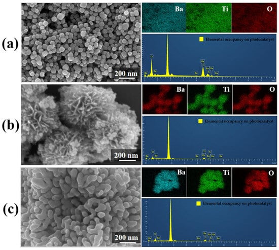 SEM and EDS mapping of BaTiO3 samples with different morphologies. (a) BTO-NPs, (b) BTO-Nf, and (c) BTO-Nc.