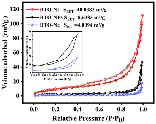 Figure 1 illustrates the overall microscopic morphology and elemental distribution of different BTO samples. The BTO-NP sample presented a large number of square nanoparticles with a size of about 50 nm, a regular morphology, a smooth surface, and good dispersion (Figure 1a). The BTO-Nf sample was a three-dimensional spherical nanoflower consisting of two-dimensional nanosheets with thicknesses ranging from 5 to 10 nm and diameters ranging from 400 to 500 nm; meanwhile, there were some globular BaTiO3 nanoparticles on the surfaces of the flowers and the whole surface could be slightly roughened (Figure 1b). A possible reason for this is that the stable BaTiO3 nanoparticles could be readily synthesized before the reaction conditions shifted towards the formation of optimal BTO-Nf. The BTO-Nc was a coral-like BaTiO3 sample with regular morphology and a smooth surface. It consisted of short rods of BaTiO3 with diameters of 60–100 nm (for the long rods) and 45–60 nm (for the short rods) (Figure 1c). The energy dispersive spectrometer (EDS) elemental mapping analysis results are shown in Figure 1a–c, where Ba, Ti, and O elements are uniformly distributed in all BTO samples with any morphology, and the atomic ratio of Ba:Ti:O ≈ 1:1:3 is reasonable based on the structural stoichiometry. This provides logical preliminary evidence that nanoparticulate, spherical nanoflower, and coral-like BTO samples had been successfully prepared. The specific surface area of the three materials was to be determined, and their nitrogen adsorption desorption isotherms are shown in Figure 2. All three samples satisfied the criteria for type IV isotherms [40]. Among them, the specific surface area of BTO-Nf was the largest, which proved that it could adsorb more TC in the reaction, followed by the BTO-NPs, and then BTO-Nc, with the smallest surface area.
