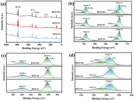To acquire more precise data regarding the elemental composition and valence of the materials, the three BTO materials were further analyzed by XPS. The XPS data for the BTO samples are shown in Figure 3 and Table 2, and the peaks in Figure 3a indicate the main peaks of the Ba, Ti, and O elements. The Ba high-resolution XPS spectra in Figure 3b display two peaks around at 778 and 794 eV, which are recognized as being for Ba 3d5/2 and Ba 3d3/2, respectively. The green peaks 1 originated from surface Ba atoms, and the blue peaks 2 are attributed to internal Ba atoms, while both peaks 1 and 2 belong to the peaks of Ba2+ [41,42]. The peaks of Ti 2p3/2 and 2p1/2 of all samples in Figure 3c are located near 458 and 464 eV, respectively, which proves the presence of Ti4+ [42]. The O 1s high-resolution spectra, as shown in Figure 3d, can be fitted into two peaks at binding energies of 529 and 530 eV, respectively, which are assigned to lattice oxygen (Olat) and surface adsorbed oxygen (Oads), respectively [43]. XPS further demonstrated the successful preparation of BTO materials.