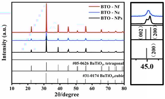 Nanoparticulate BaTiO3 (BTO-NPs): Firstly, 10 mmol of tetrabutyl titanate was added into a 50 mL polytetrafluoroethylene reactor, and 4 mL of anhydrous ethanol was added to make it dissolve under stirring. Next, 1.5 mL of ammonia was poured into the above solution and stirred for 20 min until completely dissolved to form a white gel. Then, 15 mmol of Ba(OH)2·H2O was ground and mixed well with 7 mL of H2O, continuously swirling to produce a white, viscous liquid. Finally, the Ba (OH)2·H2O white sol was mixed with the solution from the first step and stirred for 1 h. Then, the mixture was transferred into the stainless-steel reactor, and kept for 24 h at 200 °C. At the end of the reaction, the products were washed with acetic acid, H2O, and ethanol, and dried at 60 °C.