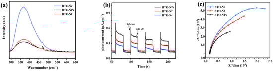 The photoelectric properties of the materials were investigated by UV–Vis absorption spectroscopy, photoluminescence spectroscopy, photocurrent, and electrical impedance. As shown in Figure 6a, all three materials were highly absorbent to UV light, and the BTO-NPs possessed the highest absorbance (200–400 nm) compared to the other morphologies. The bandgap energy of the semiconductors was calculated based on the equation αhv = A(hv-Eg)n/2, where n = 1 for direct bandgaps and n = 4 for indirect bandgaps [48]. Accordingly, the band gaps of the BTO-NPs, BTO-Nf, and BTO-Nc were 3.03, 3.08, and 3.23 eV, respectively (Figure 6b). Minor changes in the bandgap were caused by the different morphologies and sizes of the as-prepared samples [49]. The relatively small bandgap of the BTO-NPs demonstrates that they had a higher tendency towards harvesting the visible-light photons which explains their improved photoactivity [50].