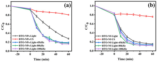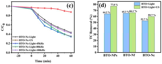 The catalytic performance of the BTO samples for degrading the TC solution under experimental conditions including light, ultrasound, and light with different ultrasound frequencies was explored (Figure 8a–c). BTO-NPs had the best piezo-photocatalytic degradation performance. The dark adsorption efficiencies were 7.9%, 19.4%, and 4.1%, for BTO-NPs, BTO-Nf, and BTO-Nc, respectively. The maximum adsorption capacity of BTO-Nf is due to it having a larger specific surface area than BTO-NPs and BTO-Nc. Under 45 kHz sonication only, BTO-NPs degraded 12.3% of the pollutant, which was higher than the figures obtained for BTO-Nf (4.8%) and BTO-Nc (9.9%), indicating that BTO-NPs performed a better piezoelectric degradation of TC. The TC degradation efficiencies of BTO-NPs, BTO-Nf, and BTO-Nc after 60 min of irradiation were only 64.2, 65.3, and 52.7%, respectively. This is because, for BTO-NPs and BTO-Nf, the morphological advantage of having a larger specific surface area exposed more active sites, which was favorable for the degradation of tetracycline [51]. When the ultrasonic force was applied with light, the degradation efficiency of BTO-NPs significantly increased to 77.0%, which was 12.8% higher than that of light only. The degradation activities of BTO-Nf and BTO-Nc, however, were not significantly different to those achieved before the application of ultrasonic force (66.1% and 59.7%, respectively). Figure 8d compares the performance of three morphologies of BTO under photocatalysis and piezoelectric photocatalysis, and it can be seen that the BTO-NPs’ piezoelectric photocatalytic effect was significantly enhanced. This was attributed to the fact that the BTO-NPs had an obvious tetragonal crystalline phase and Ti4+ in BTO nanoparticles in the tetragonal crystalline phase was displaced along the c-crystal-axis direction to form an asymmetric crystal structure, which was more easily polarized after ultrasound assistance and promoted the separation of electron-hole pairs, thus enhancing the piezoelectric photocatalytic degradation of TC. BTO-Nf and BTO-Nc belong to the cubic crystalline phase. The cubic crystalline phase of the BTO material Ti4+ is located in the body center of the crystalline cell, which is a centrosymmetric material; hence, there is no spontaneous polarization, and, therefore, a piezoelectric effect cannot be produced [52,53]. This evidently supports the statement that nanomaterial crystal structure is a key factor influencing the effectiveness of piezoelectric photocatalysis.