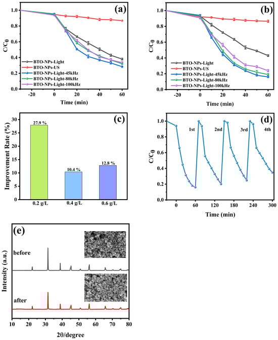 TC degradation curves with 0.4 g/L (a) and 0.2 g/L of the catalyst (b). Percentage increase in photocatalytic degradation of different amounts of BTO-NPs after ultrasonication (c). The results of cycling experiments of BTO-NPs with 0.2 g/L (d). XRD and SEM patterns before and after degradation (e).
