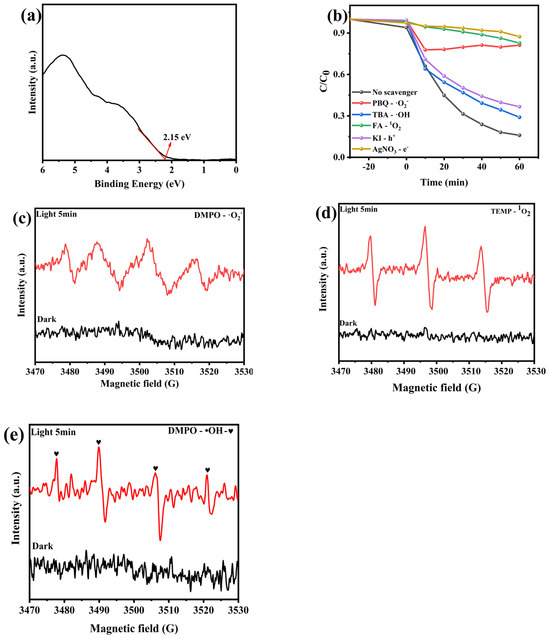 VB–XPS spectra of BTO-NPs (a). The results of active species quenching tests (b), and the ESR signals for: ·O2− (c), 1O2 (d), and ·OH (e).