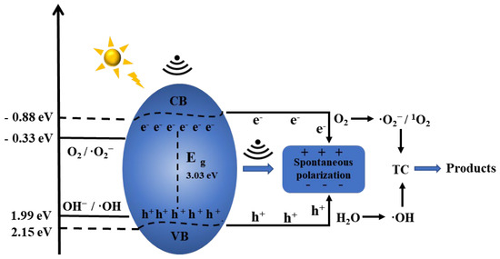 A plausible TC degradation mechanism over the BTO-NP piezoelectric photocatalyst was suggested based on the abovementioned findings (Equations (1)–(9) and Figure 11). The polarized electric field caused the oxidation and reduction reactions to occur in two different directions, inhibiting the combination of e− and h+, which demonstrated a synergistic effect of ultrasound and light resulting in an improved catalytic TC degradation under the mild conditions. Under light, e−-h+ pairs are generated in the conduction band and valence band of BTO-NPs (Equation (1)). When the ultrasound (US) source was turned on, BTO-NPs were deformed by the force, causing the conduction and valence bands to tilt, forming a piezoelectric potential on the surface through inducing a strong polarized electric field consisting of negatively charged regions (C− domain) and positively charged regions (C+ domain) (Equation (2)) [59]. As a result, the e− and h+ were easily attracted to the positively and negatively charged regions, respectively (Equations (3) and (4)) [60]. The e− and O2 reacted to form ·O2−, and ·O2−- continued to be attacked by e− generated by piezoelectricity and photocatalysis to generate 1O2 (Equations (5) and (6)). The h+ and H2O reacted to form ·OH and H+ (Equation (7)) [61]. The generated radicals attacked the TC chemical structure to transform it into products (Equations (8) and (9)). This mechanism is equally applicable to other similar piezoelectric photocatalytic materials.