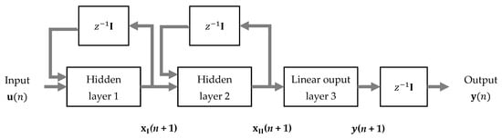 A neural network with one hidden layer is a model of a system in state space, characterized by Equations (2) and (3). Typically, recurrent multilayer perceptron, which has one or more hidden layers, is more efficient; the structure of this is shown in Figure 1.