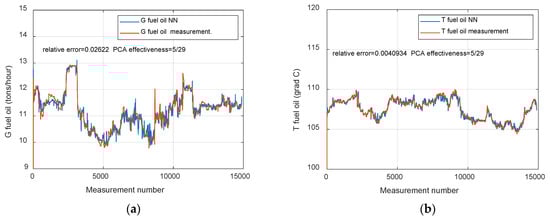 The number of principal components determines the size of the ANN input layer. Reducing the size of the input layer led to a significant increase in the error in calculating the criteria. To verify this statement, the result of modeling criteria using ANN for five principal components was obtained. The simulation results are shown in Figure 3. The average relative error in simulating fuel oil flow and temperature was 0.03 and 0.004, respectively. Considering the presence of noise when performing measurements in industrial environments, the simulation result is satisfactory.