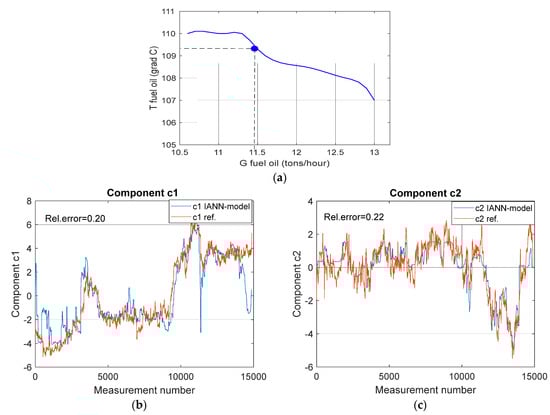 Using this value, we can determine what the control parameters of the fuel oil preparation system should be to reach the target mode specified on the plane . If you set all available operating modes of the system as target modes, then you can check the algorithm, and the verification will be complete. The second neural network, INN, is trained to map any point in the space to the principal components of the control parameters. Based on the test results, the relative was calculated to determine the principal components corresponding to each mode with a data volume of 15,000. Figure 4a,b show the values of the first and the second principal component of the control parameters obtained using , their actual values, and relative error. The graphs show that the use of only one component allows for you to get 80% closer to the specified mode; the use of the second component allows for you to get even closer to the optimal mode.