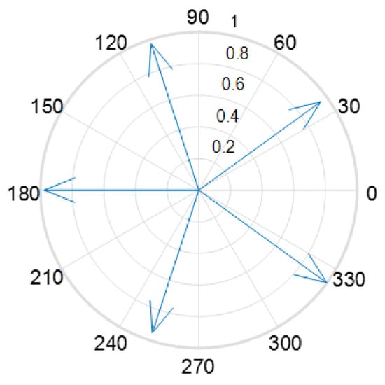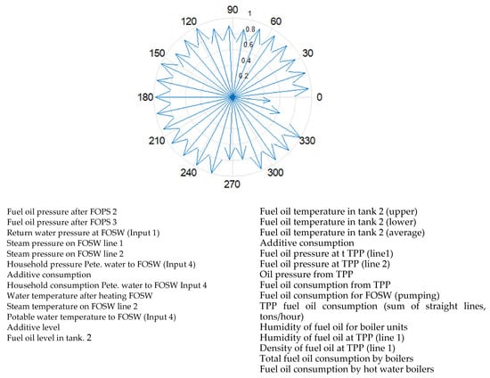 Figure 5 shows a polar diagram of the principal components of control parameters, the values of which make it possible to determine the optimal mode for the fuel oil preparation system corresponding to the selected point on the Pareto frontier shown in Figure 4a. Based on the dynamic principal components, it is possible to determine recommended sequences changing the values of control parameters when necessary to achieve the optimal value of the criteria. Figure 6 shows the recommended physical values of the control parameters recovered from the DPCA. The parameter values shown in Figure 5 and Figure 6 are normalized in such a way that the maximum parameter value is equal to one.