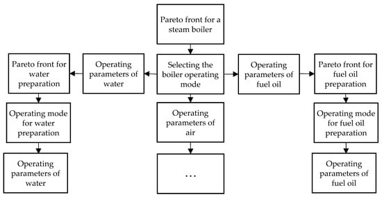 The solution to the problem was divided into several hierarchically organized stages, which are shown in a simplified form in Figure 8, where three dots show blocks that perform similar functions (calculating the Pareto front for air preparation, operating mode for water preparation, and control parameters for air preparation). At the top level of the hierarchy, general goals were set for the boiler equipment control system: efficiency. and system performance. Specific target values for steam boiler efficiency and steam boiler productivity were selected on the Pareto frontier. Then, in accordance with the developed algorithm, using a pre-trained INN for the boiler system, all control parameters were determined that could help to achieve the specified target operating mode of the boiler equipment as a top-level system.