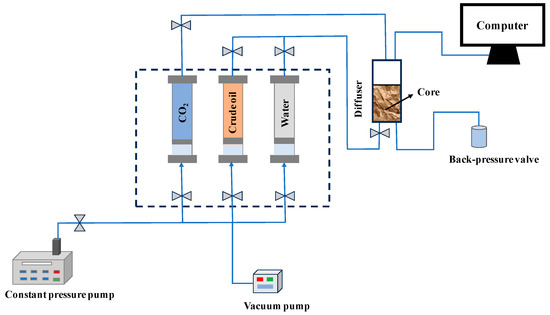 Detailed laboratory studies on the physical properties of CO2–crude oil systems and CO2–formation water systems have been carried out by many scholars at home and abroad. The effects of different temperatures and pressures on the solubility and diffusion coefficient of CO2 in oil/water have been measured through laboratory experiments [9,10,11,12,13]. The ability of CO2 to dissolve in oil/water after injection into a reservoir has significance for the study of the laws affecting the storage of CO2 in reservoirs. The law governing the erosion of CO2 in heavy oil systems was studied in detail by Miller and Jones using dehydrated and degassed heavy oil from three different oilfields in the eastern United States [14]. Experimental temperatures of 25 °C, 50 °C, and 90 °C were selected, and the experimental pressure range was 1.5~36 MPa. When the experimental temperature was 25 °C, the CO2 solubility curve had an inflection point at its saturation pressure. After exceeding the saturation pressure, the physical properties of the CO2 changed. The diffusion coefficient determines the erosion rate and diffusion efficiency of CO2 in reservoir fluid and ultimately affects the spread range and storage rate of CO2 as well as the crude oil recovery. Therefore, it is very important to establish a diffusion mass transfer model using molecular diffusion and to study the diffusion law of CO2 in its liquid phase. A physical model of the diffusion of CO2 into its liquid phase using a constant-volume PVT cell was constructed by Riazi [15]. The pressure change–time function and the liquid level position–time function were linked with the diffusion coefficient by Riazi. The diffusion coefficient was obtained by determining the change in the gas–liquid boundary position with time and the change in pressure with time at a constant temperature. This method was used to obtain measurements from a methane–pentane system at 311 K and 7 MPa, and the corresponding data errors were all below 5%.