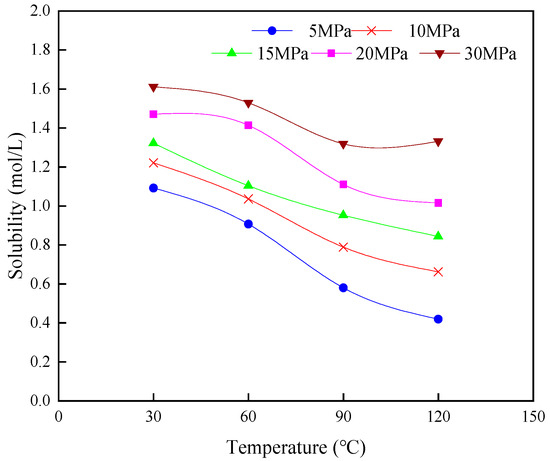 As Figure 2 shows, the solubility of CO2 in formation water increases as the pressure increases. The solubility coefficient of CO2 in water is higher under low pressure, and the solubility increases rapidly with pressure. However, when the pressure rises to a certain value, the solubility coefficient of CO2 in formation water decreases gradually, and the rising trend of solubility tends to be stable and slow. The solubility curve has an obvious inflection point near 20 MPa. As Figure 3 shows, the solubility of CO2 in formation water decreases as the temperature increases. The higher the temperature, the faster the movement of the carbon dioxide molecules in the water. In this case, the CO2 molecules tended to escape from the aqueous phase, resulting in a decrease in the solubility of the CO2. When the temperature was above 100 °C and the pressure was above 20 MPa, the solubility of the CO2 in the water changed significantly compared with that observed at low temperatures. When the pressure exceeded 20 MPa, the solubility still increased steadily with the increase in pressure and finally exceeded the solubility below 100 °C. The properties of CO2 change under high temperatures and high pressures, and its solubility increases as the temperature increases, indicating the great potential for the dissolution and storage of CO2 in high-temperature and high-pressure reservoirs.