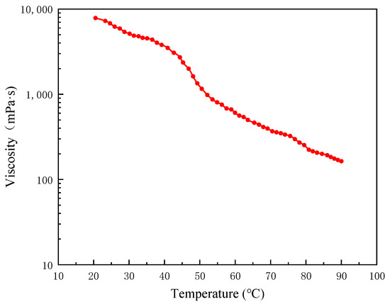 The viscosity–temperature relationship curve of the dehydrated and degassed crude oil was measured using a rheometer, and the viscosity–temperature semi-logarithmic curve of the crude oil sample is shown in Figure 5. As the temperature increased, the viscosity of the crude oil sample decreased significantly. Between 20 °C and 85 °C, the logarithm of viscosity showed a linear relationship with temperature. When the experimental temperature was 20 °C, the viscosity of the oil sample was 7841 mPa·s. When the experimental temperature reached 85 °C, the viscosity of the oil sample was 200 mPa·s. After the temperature reached 85 °C, the viscosity of the oil sample decreased.