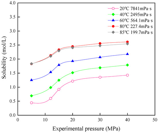 (1) The variation in the solubility of CO2 in crude oil with pressure is similar to that in formation water. The solubility of CO2 increases as the pressure increases under low-pressure conditions. As the temperature increases, the viscosity of crude oil decreases significantly, and the solubility of CO2 is significantly increased in low-viscosity crude oil.