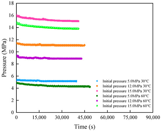 The pressure–time relationship for the process of CO2 diffusion into the oil phase is shown in Figure 9. The diffusion coefficient results of the CO2 in the oil phase are shown in Table 7. The diffusion coefficient of the CO2 in the oil phase was roughly consistent with that in the water phase. The diffusion coefficient of the CO2 in the oil phase also increased when the temperature and pressure increased. Due to the reduction in the viscosity of the crude oil brought about by the increase in temperature, the solubility of the CO2 in the crude oil increased, and the capacity of the liquid phase to accommodate CO2 was thereby improved, making it easier to diffuse the CO2 into the oil phase at high temperatures. As the pressure increased, the number of carbon dioxide molecules per unit volume increased, and the probability of collisions between the carbon dioxide molecules increased. The thermal motion of the molecules intensified and the diffusion of the CO2 molecules accelerated. In addition, as the temperature increased, the viscosity of the crude oil decreased, and the kinetic energy of the fluid molecules increased. The degree of thermal motion intensified, promoting the diffusion of the CO2. The order of magnitude for the diffusion coefficient of the CO2 in the oil phase and the water phase was 10−8 m2/s. However, the diffusion coefficient of the CO2 in the oil phase was higher than that in the water phase under the same temperature and pressure conditions.